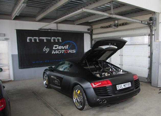 În România, MTM este reprezentată de Devil Motors. În ziua când i-am vizitat, în service se afla un exotic Audi R8 negru mat. Este vorba de un exemplar unic, cunoscut sub denumirea Audi R8 888 MTM. A fost vedeta salonului de tuning de la Dubai de acum câţiva ani şi cei de la Devil l-au expus la Salonul Auto de la Bucureşti din acest an. Şi dacă tot a ajuns, aici, Audi-ul a trecut printr-o revizie a masivei turbine efectuată chiar aici, în România.