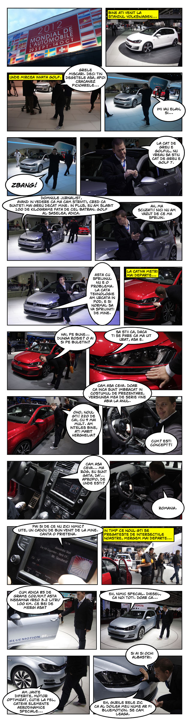 Standul Volkswagen de la Paris te face să vrei să înveți Golf. Ceea ce nu e chiar rău, având în vedere că unele exemplare au dungă roșie pe buletin. Din fericire, ne-am împrietenit repede: Golf 7 știe să cânte în limba română.