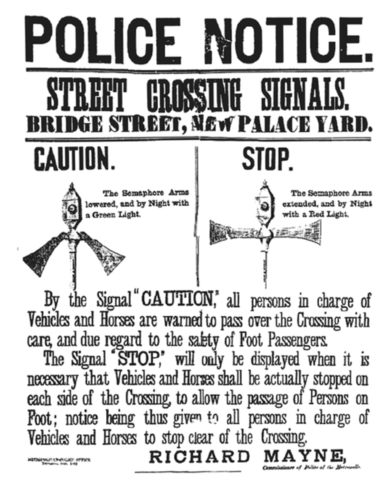 Era un semafor mecanic care folosea un set de braţe orizontale pentru a controla traficul dens de trăsuri. Noaptea, o lampă cu gaz era aprinsă şi un set de sticle colorate în verde şi roşu indicau participanţilor la trafic ce să facă. Iniţial, aceste semafoare erau controlate manual de către un ofiţer de poliţie. El decidea indicaţiile semaforului în funcţie de trafic şi fluiera înainte să schimbe poziţia acestuia. Din păcate, s-au dovedit însă a fi periculoase din cauza ţevilor de gaz care treceau pe sub semafoare. În 1869, un astfel de semafor a explodat, rănindu-l grav pe poliţistul care îl opera şi Londra renunţa astfel la acest tip de indicator.
