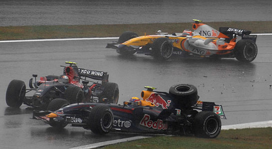 Webber spera ca la reluarea cursei să-l poată depăşi pe pilotul McLaren pentru a câştiga cursa, mai ales că britanicul nu era dispus să rişte în contextul implicării sale în lupta pentru titlul mondial cu Alonso. Planurile sale au fost însă spulberate când, în timp ce rula în spatele Safety Car-ului, a fost lovit puternic din spate de un monopost Toro Rosso. Pilotul aflat la volanul acelui Toro Rosso era nimeni altul decât Sebastian Vettel, aflat la vremea respectivă la doar a şasea cursă în Formula 1.