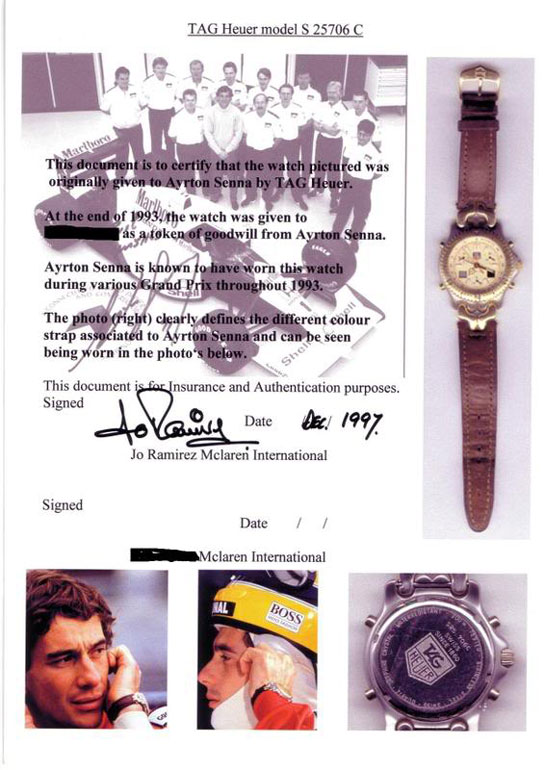 În acel moment, la insistenţele fiului său, mecanicul a decis să vândă ceasul şi a obţinut chiar şi un certificat de autenticitate din partea lui Jo Ramirez, coordonatorul McLaren din perioada în care Senna a concurat pentru echipă. Preţul obţinut de casa de licitaţii Bonhams în mai 2007 pentru ceasul lui Senna a fost de 48.000 de euro.