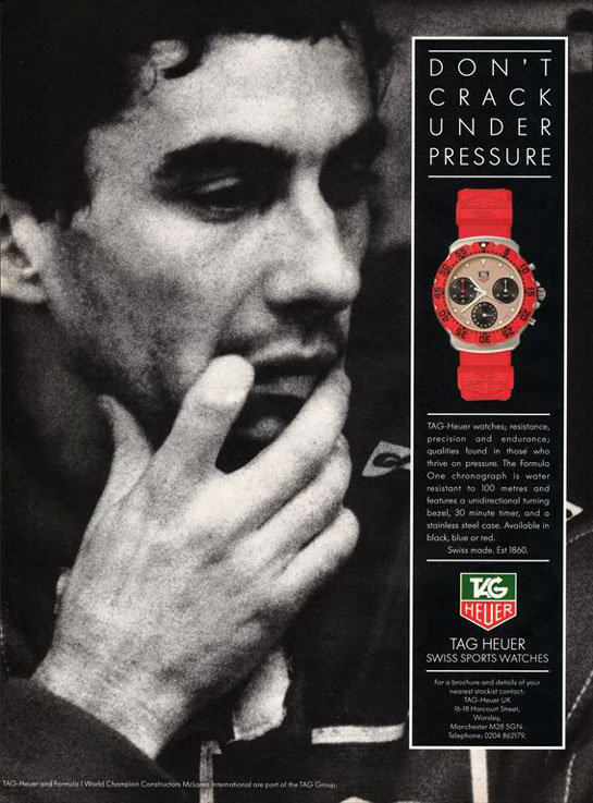 "Ceasurile TAG Heuer - rezistenţă, precizie şi anduranţă, calităţile regăsite la cei care trăiesc sub presiune. Ceasul pentru Formula 1 rezistă la 100 de metri adâncime şi are o ramă unidirecţională, timmer de 30 de minute şi carcasă din oţel inoxidabil. Disponibil în negru, albastru şi roşu. Fabricat în Elveţia. Din 1860", este mesajul pe de afişul publicitar în care a apărut Senna.