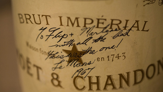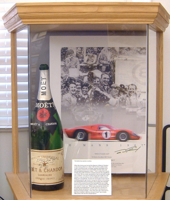 Totuşi, indiferent de atenţia la detalii pe care o acordă acum G.H. Mumm, cea mai valoroasă va rămâne, fără îndoială, prima sticlă de şampanie împrăştiată pe un podium de premiere. Iar aceasta este în prezent chiar în mâinile lui Dan Gurney, întrucât fotograful Flip Schulke i-a dat-o înapoi cu câţiva ani în urmă.