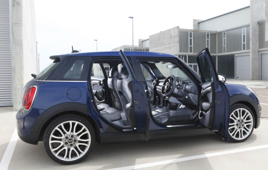 Odată cu lansarea versiunii de caroserie cu cinci uşi, Mini Cooper înregistrează un hotar important pentru, modelul oferind în premieră cinci locuri la bord şi un portbagaj mai mare, care cumulează 278 de litri. Dacă îl comparăm cu versiunea cu trei uşi, observăm o diferenţă de 67 de litri în plus la nivelul portbagajului, 15 milimetri în plus pentru capetele pasagerilor din spate şi 61 de milimetri în lăţime în plus pentru coatele acestora. În cazul în care bancheta spate cu trei locuri individuale, rabatabilă 60:40, este pliată, volumul spaţiului de încărcare urcă la 941 de litri. La fel ca în cazul celorlalte elemente, versiunea cu cinci uşi a hatchback-ului beneficiază de aceeaşi planşă de bord, aceleaşi comenzi şi aceleaşi elemente de design şi tehnologie lansate în urmă cu câteva luni pe fratele său mai mic.