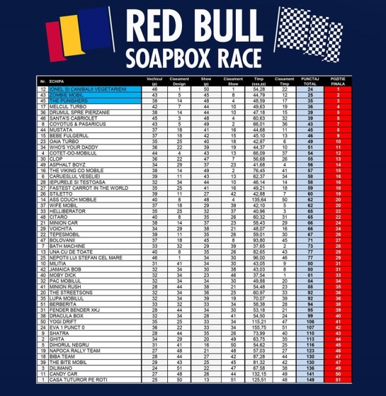 Dintre echipajele înscrise s-a remarcat Ionel şi Canibalii Vegetarieni, show-ul făcut la start şi construcţia automobilului impresionând juriul. Deşi nu a avut cea mai rapidă coborâre, echipajul de canibali avea să se claseze pe primul loc după ce punctele au fost cumulate. Locul doi a fost ocupat de către Zombie Mobil, iar podiumul a fost completat de către The Punishers. Cea mai rapidă coborâre a fost înregistrată, culmea, de către echipajul Moby Dick, cu ajutorul unui automobil în formă de balenă. Ei au parcurs traseul în 37.54 secunde, în timp cea cel mai lentă coborâre a aparţnut echipajului Eva 1 punct 0 cu un timp total de 155.75 secunde. Clasamentul complet poate fi regăsit mai jos.