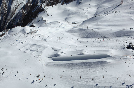 După câteva coborâri pe schiuri, o telecabină, ale cărei fire au fost întinse pentru prima dată în 1965, urcă uşor către vârful gheţarului. Până la 3029 de metri, traseul străbate o vale colţuroasă, în mijlocul căreia austriecii au ridicat cel mai înalt stâlp pentru telecabină din lume: 113 metri. Aproape cât cea mai înaltă clădire din România, inaugurată anul acesta.