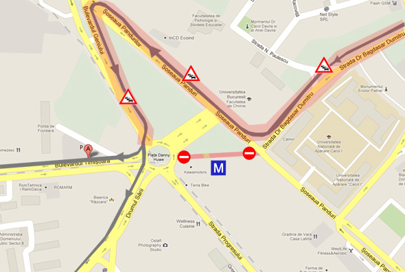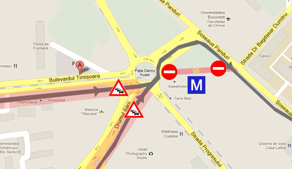 Intersecţia de la Răzoare (Piaţa Danny Huwe) s-a schimbat radical de câteva zile. Motivul: construcţia staţiei de metrou Academia Militară în această intersecţie, una dintre cele mai aglomerate din întregul Bucureşti. Pe aici se "varsă" dimineaţa (între orele 7 şi 10) înspre oraş toate maşinile din cartierele Drumul Taberei şi Ghencea, variantele alternative fiind mult prea lungi pentru a fi luate în considerare. De asemenea, tot pe aici vin seara aceleaşi maşini, intervalul orar 18-20 fiind unul de chin pentru cei care se încumetă să ajungă în zonele din sud-vestul capitalei.