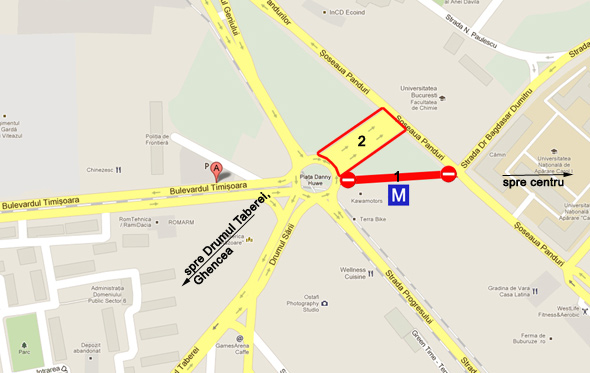 Dacă redesenarea intersecţiei, care a avut loc acum doi ani, a fluidizat cât de cât zona cu ajutorul unui sens giratoriu complex, lucrurile s-au schimbat din nou în această lună, când intersecţia se vede sufocată din nou. Motivul: strada Răzoare, o porţiune de 100 de metri care făcea legătura în dublu sens dintre intersecţie şi Academia Militară, a fost închisă (cifra 1 pe hartă). A apărut în schimb o nouă bretea (cifra 2 pe hartă) care leagă intersecţia cu Şoseaua Panduri, doar că aceasta permite traficul într-un singur sens: cel înspre centru. Pentru a ajunge înapoi în cartier, maşinile trebuie să ocolească zona cu aproximativ un kilometru. Un kilometru de trafic bară la bară. Pentru că noul desen al intersecţiei situaţia funcţionează, dar numai pe sensul de ieşire din Drumul Taberei.
