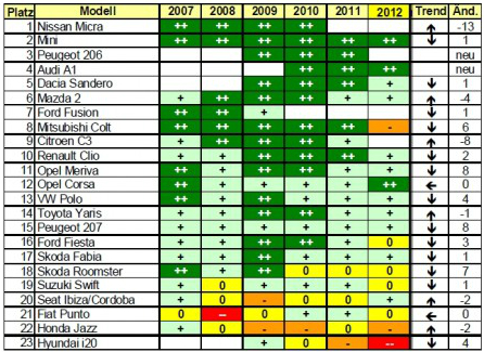 Peugeot 206 pe 2??? :))) Oricum Colt are un binemeritat loc 8. Mai e putin si se fac 10 ani de la lansare iar masina asta este in fata multor masini concurente mult mai tinere. La fel e si cazul lui Fusion, o masina oarecum neinteleasa, dar fiabila. Nu este prima data cand se claseaza bine. Corecta mi se pare si clasarea lui Sandero. Si acum sa spuna idolii lui Renault cum ca nemtii mananca mult maro, ca nu stiu ce e aia masina buna si ca sa nu aiba Clio vanzari atat de mari, este tocmai pe locul 10.