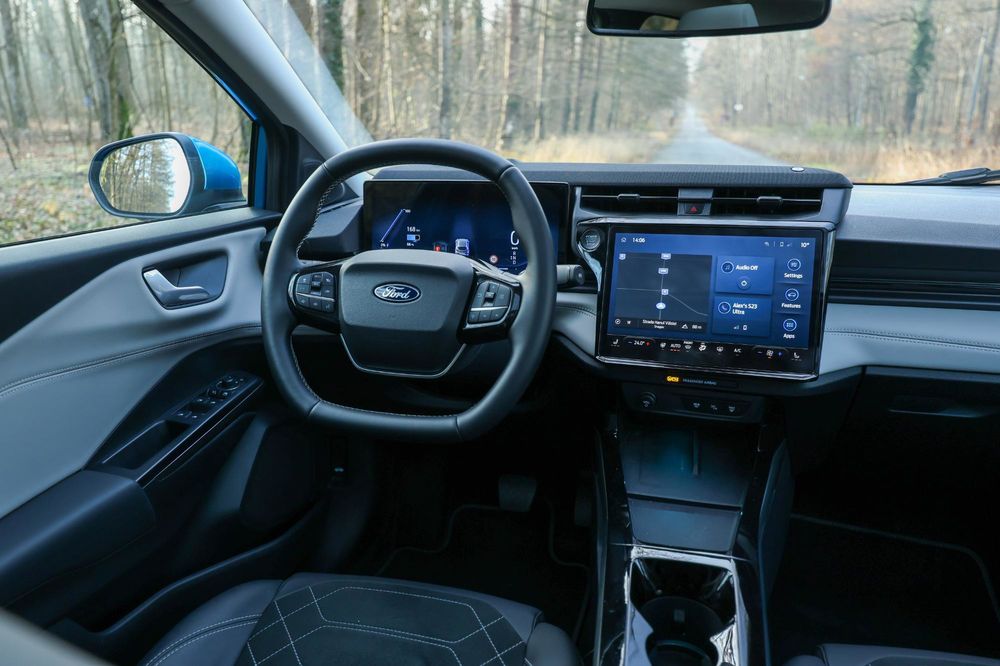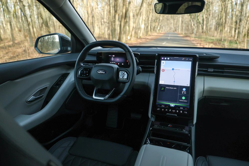 În centrul planșei de bord avem un sistem multimedia SYNC4 cu un ecran de 12 inch. Operarea sa este ușoară, meniul este simplist, iar grafica este excelentă. În partea de sus, primești un soundbar B&O care traversează bordul, lucru care creează o acustică plăcută în habitaclu.