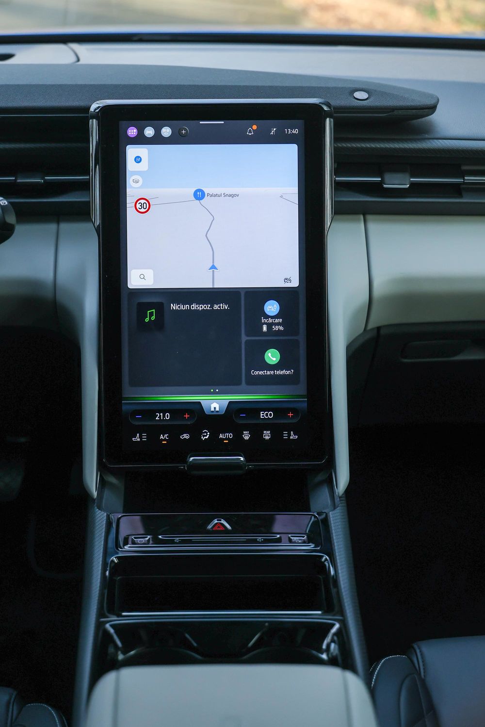 Totodată, sub consola centrală mai există un spațiu generos de depozitare. Totuși, trebuie să știți că dacă trebuie să vă ascundeți prăjiturelele de Moș Crăciun o puteți face liniștiți. Ecranul central culisează față-spate, acțiune de mare ajutor când soarele bate pe acesta și te orbește. Atunci când culisezi ecranul în spate, apare la orizont un alt spațiu de depozitare.
