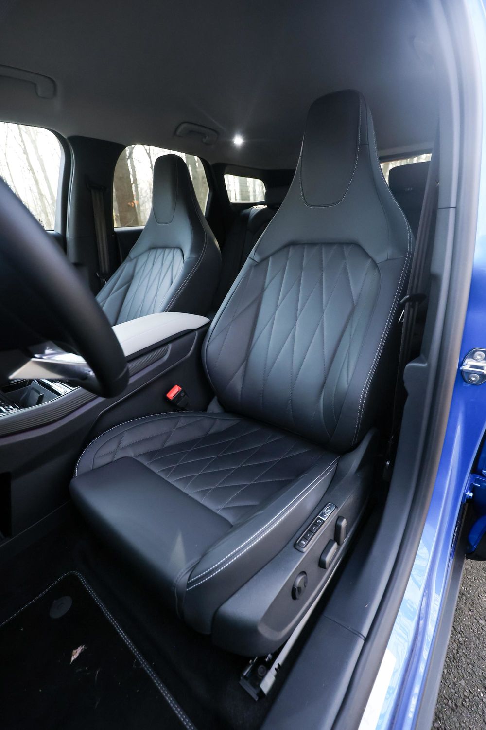 În mare parte, materialele sunt calitative, cel puțin în zonele superioare. În zona de jos a bordului și ușilor vei regăsi un plastic ceva mai tare și neprietenos. Scaunele au venit îmbrăcate într-o tapițerie Sensico în culoarea Negru Onyx. Aici apare o mică imparțialitate între șofer și pasager. Dacă pasagerul din dreapta are parte de un scaun cu reglaj manual, șoferul are parte și de reglaj electric, dar și de masaj.