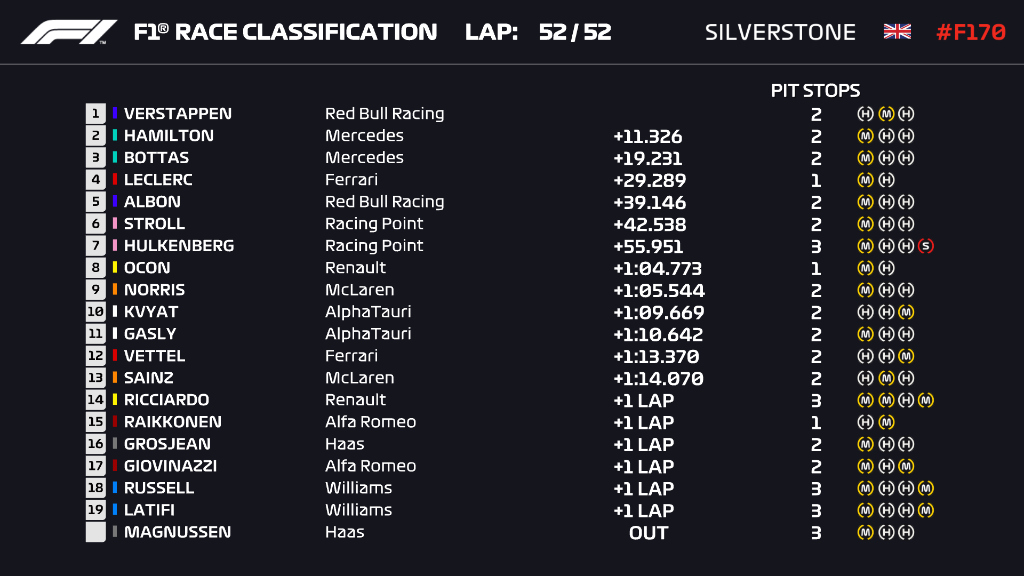 Max Verstapppen a câștigat cursa de la Silverstone după o strategie mai eficientă la boxe a celor de la Red Bull. Lewis Hamilton l-a depășit pe Valtteri Bottas în lupta pentru locul doi cu numai două tururi înainte de final.