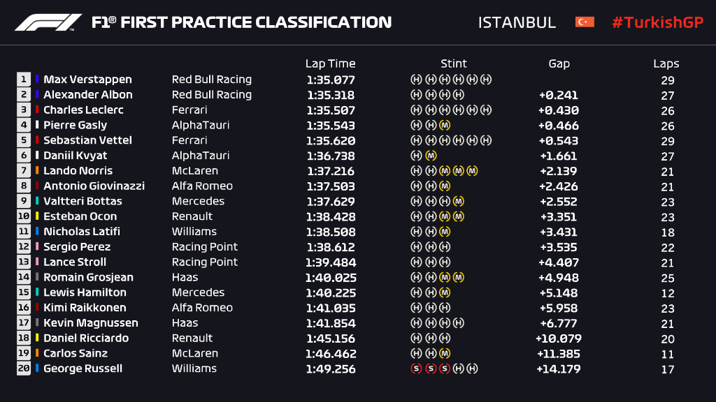 În prima sesiune, Verstappen a fost urmat de coechipierul său, Alexander Albon, în timp ce Ferrari a obținut locurile 3 și 5 prin Charles Leclerc și Sebastian Vettel.
