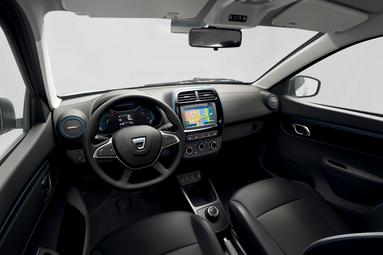 Standard, Dacia Spring este echipată la interior cu un ecran cu diagonala de 3.5 inch care suportă inclusiv sistemul de recunoaștere vocală Google sau Apple prin apăsarea unui buton poziționat pe volan.