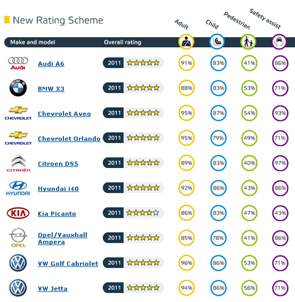 Dacă nimeni nu se aştepta ca rezultatele obţinute de modele premium precum Audi A6 sau BMW X3 să fie mai slabe de cinci stele, este foarte intersant de subliniat evoluţia clară a celor de la Chevrolet, care au reuşit să adune cinci stele atât cu Aveo, cât şi cu noul monovolum Orlando. Mai mult, noul Chevrolet Aveo a demonstrat că este cea mai sigură maşină din segment şi una dintre cele mai sigure testate de EuroNCAP la toate categoriile: Protecţia copiilor (87%, cel mai bun scor din această sesiune de teste), Protecţia pietonilor (54%, al doilea scor din această sesiune după cel al lui VW Jetta) şi Sisteme de asistenţă (93%, al doilea scor din această sesiune, după Citroen DS5).