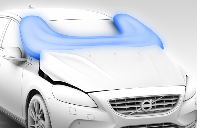 Volvo a lansat în premieră acest tip de airbag pe noul model V40. Amplasat la baza parbrizului, airbagul pentru pietoni protejază victima unui accident de impactul cu parbrizul maşinii. Sistemul detectează dacă accidentul a implicat un pieton şi acţionează capsele explozive care îndepărtează prinderea capotei eliberând un airbag în formă de U care acoperă o parte din parbriz.