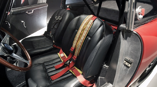 Interiorul are scaune din piele şi mochetă de calitate deşi este un automobil de curse.