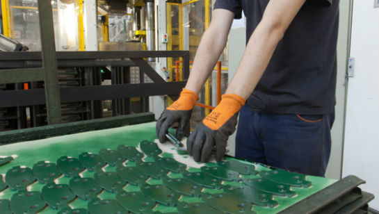 Cât am vizitat noi cămara, plăcuţele au ieşit de la copt şi aşteptau să fie împreunate cu suporţii verzi de care vă vorbeam mai devreme. O presiune de jumătate de tonă lipeşte cele două componente care merg din nou în cuptor. La ieşire, asemeni covrigilor ce aşteaptă să fie înşiraţi pe sârmă, plăcuţele sunt maronii şi aşteaptă să fie înşirate pe următoarea bandă. Se pot vedea straturile componentelor amestecate de „bucătar”. Suntem avertizaţi că sunt casante şi se pot sparge dacă le scăpăm din mână. „Crudo, crudo”, ne şopteşte şi Mario.