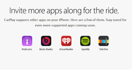 Printre primele aplicaţii suportate nativ de CarPlay se numără Beats Radio, iHeartRadio, Spotify, Podcasts şi Stitcher. Spre deosebire de aplicaţiile integrate până acum în maşină folosind telefonul şoferului, sistemul CarPlay va juca rolul unei interfeţe care să nu necesite atenţia şoferului, putând fi controlată prin interfaţa fizică a vehiculului sau prin asistentul virtual Siri.