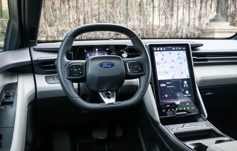 Pentru a fi în ton cu vremurile, noul Ford Capri preia aceeași abordare ca în cazul altor modele electrice. În interior vei vedea puține butoane, iar cele pe care le vei folosi cel mai des sunt capacitive, adică pot fi acționate fie printr-o simplă atingere, fie printr-o apăsare mai fermă. Asemenea butoane vei găsi pe volan și imediat sub ecranul central, unde ai comenzi pentru pornirea și oprirea radioului, reglarea volumului, luminile de avarie și activarea asistentului de parcare.
